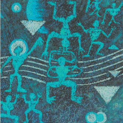 罗小华的这幅《月光曲》向观者展示了一幅蓝调艺术世界。在巴黎学习西方艺术期间,罗小华深受西方色彩影响,对蓝色有着特别的热爱。因此,在罗小华的作品中,有很多以蓝色为主色调的画作。这幅《月光曲》是罗小华内心沉寂的独白作品。画作灵感源于远古岩画上的涂鸦,舞蹈的原始人类是画面最引人注目的部分。这些集体舞形象应是远古社会生活中最原始的律动,展现夜晚驱逐野兽或是庆祝白天狩猎成果丰厚的情景。热情的舞蹈和冷寂的色调形成鲜明对比,让整个画面充满冲击力。罗小华这幅《月光曲》将西方光影艺术和中国古典艺术相结合,展现了中西合璧作品的无限艺术魅力。