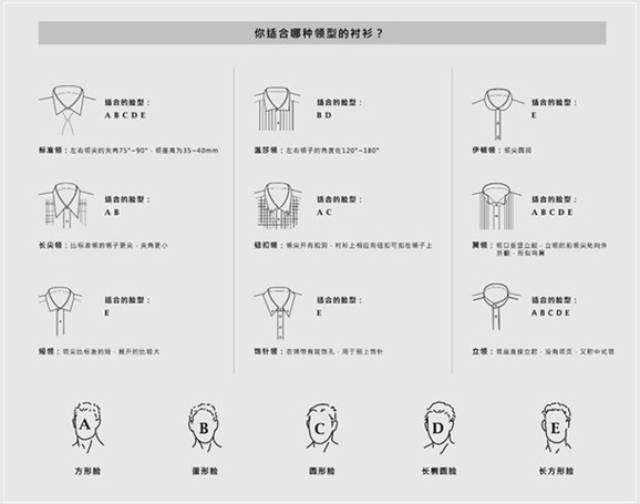 衬衫的领型是多种多样的,各显出不同的风格。男士要购买适合的衬衫,首先应对各种衬衫领型有一个大体的了解,即男式衬衫一般有哪些领型,这些领型分别适合什么样的脸型的人穿;其次还要从自己的实际出发,根据个人的气质、爱好、习惯等几方面来综合考虑。然后再去挑选适宜于自己的衬衫领型。。其实,挑选一件合适自己的衬衫,除了可以修饰脸型外,还可以精准地适应各种不同场合,而从长远来看,合理的挑选更能节省治装费用。