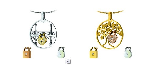 Lock&LOVE系列上挂有的爱之锁设计有不同形状及材质可供选择, 可被挂于爱之桥或爱之树吊坠上, 也可取下单独配链佩戴.