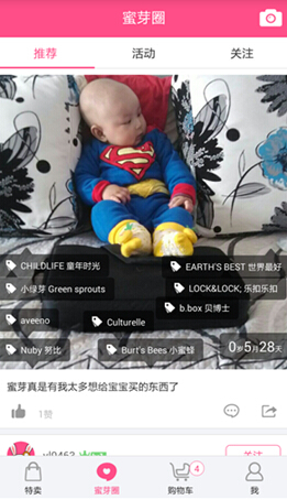 新版蜜芽圈在社交方面的各项功能也配备齐全。用户可随意关注达人或互粉为好友,随时查看他们的最新动态。此外,还能通过发图、互动等形式积攒“蜜豆”,提升在蜜芽圈中的等级,等级高的蜜粉会被直接推选为达人。用户在蜜芽圈不仅能以图文并茂的形式分享自己的购物单,还能在图中直接添加可链接到商品页面的品牌标签,将心仪的物品以直观、快速的形式分享给大家。类似像微信“朋友圈”的商品浏览体验,让移动购物也很亲切、真实。