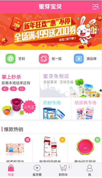 蜜芽宝贝新开辟了多个特卖频道,如“掌上限时秒杀”、“爆款推荐”等。每天精选多款热卖进口名品以超低折扣的价格回馈给消费者,让妈妈们移动网购更加过瘾。
