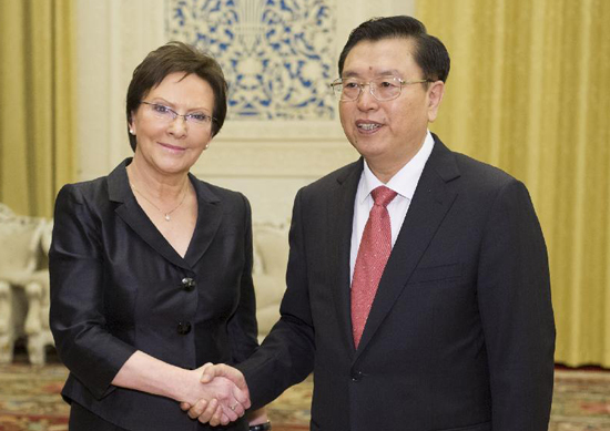张德江说,波兰是世界上最早承认并与新中国建立外交关系的国家之一。建交60多年来,两国关系总体发展顺利。近年来,中波关系进入快速发展轨道,两国确立了战略伙伴关系,建立了总理定期会晤等重要机制,合作成果丰富。中方始终珍视与波兰的传统友谊,致力于深化中波关系,希望双方继续尊重并照顾彼此核心利益和重大关切,进一步加强务实合作,巩固传统友谊,共同促进中波战略伙伴关系健康稳定发展。