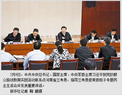 5月9日上午,习近平一下飞机,就在河南省委书记郭庚茂、省长谢伏瞻陪同下,前往兰考县。一路上,他听取了有关兰考县开展教育实践活动情况的汇报。抵达兰考县后,他来到焦裕禄干部学院,参加并指导县委常委班子专题民主生活会。