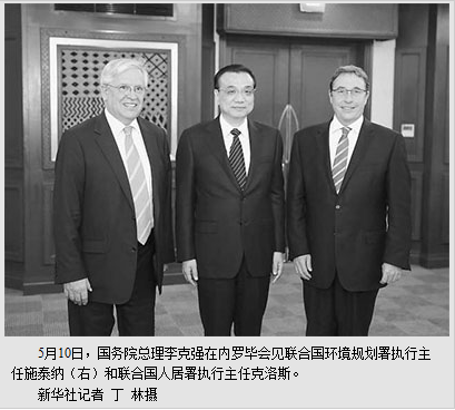 李克强积极评价和赞赏联合国环境规划署和人居署长期以来为推动国际环境、发展和民生事业作出的贡献。他表示,中国作为两署成员,一直支持两署工作,同两署开展了广泛有效合作。李克强指出,当前,中国政府正在大力推进生态文明建设,努力实现经济、社会、环境的协调、可持续发展,新型城镇化进程也正处在深入发展的关键时期。中方愿继续围绕促进绿色发展、提高环境管理能力、推动环境保护和应对气候变化南南合作等战略主题,以设立“世界城市日”为契机,同两署深化交流合作,与各国加强经验交流,推进全球可持续发展事业。