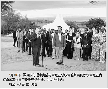 本报内罗毕5月10日电 (记者吴乐珺、蒋安全、倪涛)国务院总理李克强10日下午与肯尼亚总统肯雅塔共同参观肯尼亚内罗毕国家公园焚烧象牙纪念地,并对中外记者发表讲话。肯尼亚副总统鲁托陪同参观。