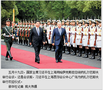 会谈前,习近平在上海西郊会议中心广场为纳扎尔巴耶夫举行欢迎仪式。