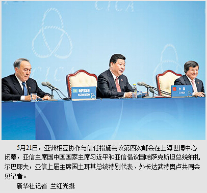 本报上海5月21日电 (记者杜尚泽、赵成)亚洲相互协作与信任措施会议第四次峰会21日在上海世博中心闭幕,亚信主席国中国国家主席习近平和亚信倡议国哈萨克斯坦总统纳扎尔巴耶夫,亚信上届主席国土耳其总统特别代表、外长达武特奥卢共同会见记者。
