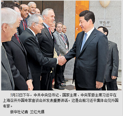 22日下午4时,习近平在中央政治局委员、上海市委书记韩正和市长杨雄陪同下,来到上海西郊宾馆会议中心。习近平同50名在沪外国专家合影留念,随后主持召开座谈会。