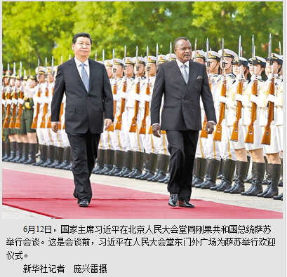习近平表示,去年3月我访问刚果共和国时,受到刚方热情接待,贵国人民对中国人民的深情厚谊令我至今难忘。我同萨苏总统就建立和发展中刚团结互助的全面合作伙伴关系达成重要共识,这是双方共同的战略选择。今年是两国建交50周年,双方要共同努力,承前启后,推动中刚关系更快、更好发展。