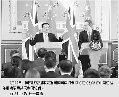 本报伦敦6月17日电 (记者吴乐珺、黄培昭、白阳)国务院总理李克强当地时间17日下午在伦敦同英国首相卡梅伦举行会谈后共同会见记者。
