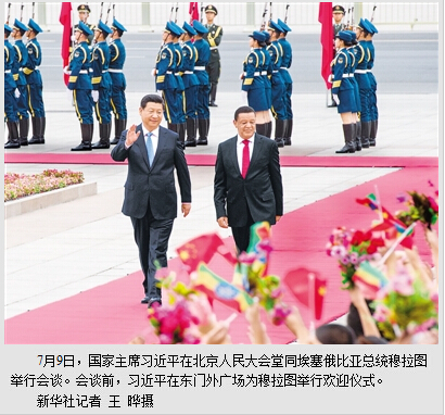 会谈前,习近平在东门外广场为穆拉图举行欢迎仪式。习近平主席夫人彭丽媛、国务院副总理马凯、全国人大常委会副委员长张平、全国政协副主席李海峰出席欢迎仪式。