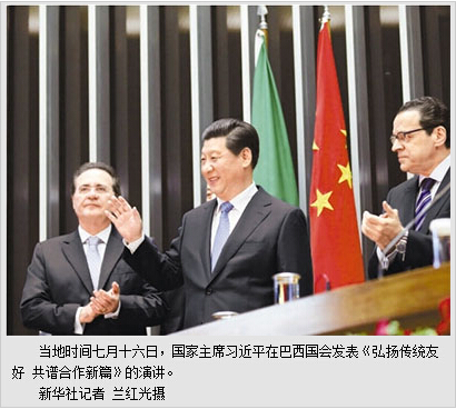本报巴西利亚7月16日电 (记者杜尚泽、侯露露)当地时间7月16日,国家主席习近平在巴西国会发表《弘扬传统友好 共谱合作新篇》的演讲,赞扬中巴传统友谊,阐述中方对发展新时期中巴关系和中拉关系的政策主张,强调以更加长远的眼光、更加宽广的胸怀、更加坚定的信心,在更高水平、更宽领域、更大舞台上推进中巴全面战略伙伴关系,推动中拉关系实现大发展,推动国际秩序朝着更加公正合理方向发展。