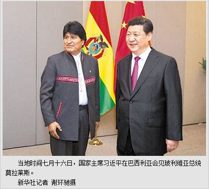 莫拉莱斯表示,中国是伟大的国家,玻方希望两国加强交往,加深两国人民友好感情。玻中关系顺利发展,双方在贸易、投资、技术转让等领域合作良好,玻方希望同中方拓展基础设施建设、卫星等领域合作,加强融资安排,实施更多合作项目。玻方重视金砖国家合作,欢迎成立金砖国家开发银行,愿意同金砖国家建立联系,共同维护发展中国家权益。