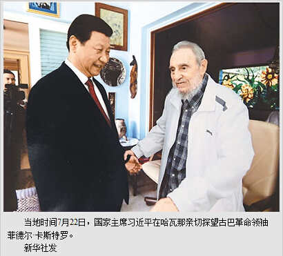 菲德尔·卡斯特罗欢迎习近平访问古巴。他表示,我怀念同中国的友好交往,相信在习近平主席和古巴领导人引领下,古中关系将取得更加丰硕成果。菲德尔·卡斯特罗表示,当前国际格局正在发生深刻变化,新兴市场国家和广大发展中国家群体性崛起,对世界产生重大而深远影响。中国是伟大的国家,中国发展必将为促进世界和平与发展发挥重要作用。我十分关注习近平主席这次拉美之行,高兴地看到金砖国家领导人会晤和中拉领导人会晤成功举行,取得重要积极成果,这将有力加强发展中国家团结合作,推动国际治理体系改革。相信金砖国家合作将不断深化,祝愿拉中关系取得更大发展。