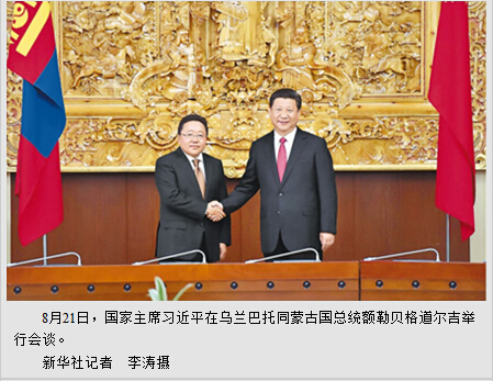 习近平指出,中蒙建交65年来,友好和合作是两国关系主流。双方都真诚尊重对方根据自己国情选择的政治制度和发展道路,都真诚照顾彼此核心利益和重大关切,都真诚视对方发展为自身发展的重要机遇,推动中蒙关系不断得到新发展。这一局面来之不易,值得珍惜。中方愿意同蒙方增进睦邻互信,深化互利合作,实现共同发展繁荣。这次双方决定将两国关系提升为全面战略伙伴关系,具有重要战略意义,符合两国和两国人民根本利益。双方要重点做好以下工作。