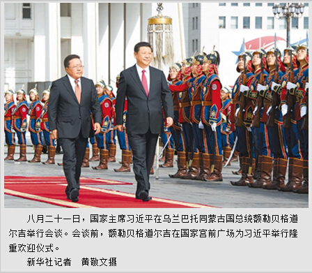两国元首举行会谈。额勒贝格道尔吉表示,今年是蒙中建交65周年,习近平主席对蒙古国进行国事访问具有重要历史意义。习近平主席是我们最尊贵的客人,蒙古国人民感到非常高兴。我认真阅读了习近平主席今天在蒙古国报纸上发表的署名文章,完全同意您就两国关系发展提出的观点。习近平主席在文章中强调,中蒙两国要做相互信任和负责任的好邻居、好伙伴、好朋友,我对此完全赞同。相信习近平主席这次访问必将推动两国合作取得更加丰硕成果,推动蒙中关系迈上新台阶。