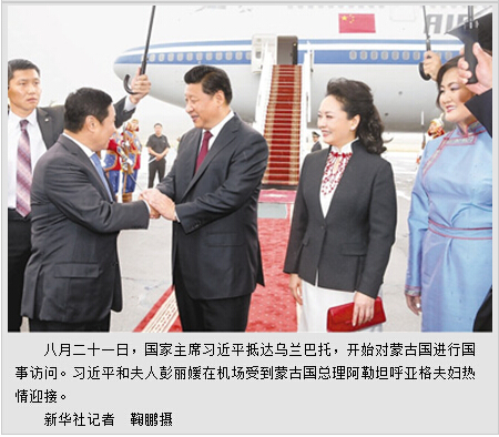 会谈前,额勒贝格道尔吉在国家宫前广场为习近平举行隆重欢迎仪式。威武的骑兵在国家宫两侧列队。习近平和夫人彭丽媛抵达时,受到额勒贝格道尔吉和夫人热情迎接。身着民族服装的儿童向习近平和彭丽媛献花。两国元首登上检阅台,军乐队奏中蒙两国国歌。习近平在额勒贝格道尔吉陪同下检阅仪仗队。习近平同蒙方主要官员及外国驻蒙使节一一握手,并向额勒贝格道尔吉介绍中方陪同人员。
