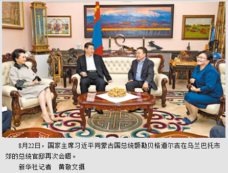中午,习近平和夫人彭丽媛抵达位于乌兰巴托市郊的总统官邸,受到额勒贝格道尔吉总统夫妇热情迎接。两国元首在亲密友好的气氛中就发展中蒙关系及共同关心的重大问题进一步交换意见。