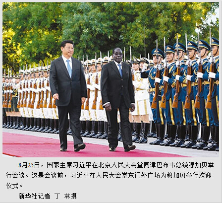 本报北京8月25日电 (记者杜尚泽)国家主席习近平25日在人民大会堂同津巴布韦总统穆加贝举行会谈。习近平高度评价中津传统友谊及穆加贝为两国关系发展做出的重要贡献,强调中国人民是重情义的,我们永远不会忘记曾经风雨同舟、相互理解和支持的老朋友。中方愿同津方一道,弘扬传统友谊,加强各领域合作,做平等相待、相互支持、互利共赢、共同发展的好朋友、好伙伴、好兄弟。