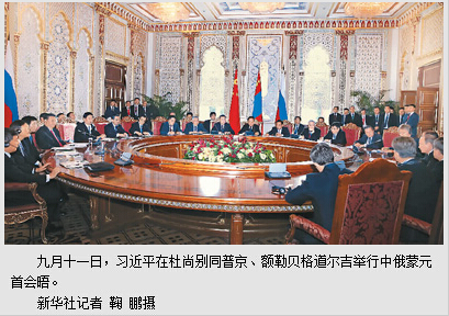 本报杜尚别9月11日电(记者杜尚泽、林雪丹)国家主席习近平11日在杜尚别同俄罗斯总统普京、蒙古国总统额勒贝格道尔吉举行中俄蒙元首会晤。