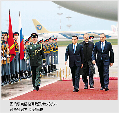 俄罗斯政府高级官员到机场迎接。俄方为李克强举行了隆重的欢迎仪式,军乐队高奏中俄两国国歌,李克强检阅了仪仗队。