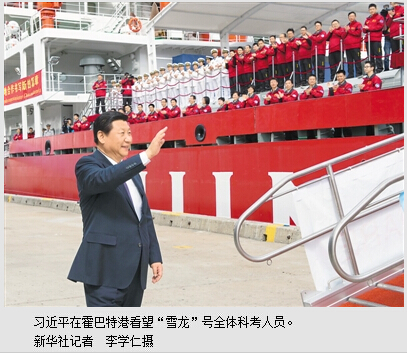 习近平离开“雪龙”号时,船员和科考人员聚集在甲板上列队欢送。习近平向大家挥手告别,祝他们一切顺利、胜利凯旋。