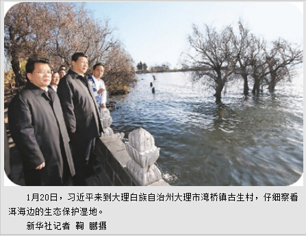 云南是拥有少数民族种类最多的省份,习近平对民族地区发展和少数民族群众生活十分关心。20日上午,他来到大理白族自治州大理市湾桥镇古生村。古生村位于洱海边,是一个典型的白族传统村落,已有1000多年历史。总书记步行穿过村中街巷。街巷道路整洁,溪水环流,绿树成荫,洋溢着浓浓的民族气息。习近平同当地干部边走边聊,向他们了解村民增收和古村落保护情况。他强调,新农村建设一定要走符合农村实际的路子,遵循乡村自身发展规律,充分体现农村特点,注意乡土味道,保留乡村风貌,留得住青山绿水,记得住乡愁。在洱海边,习近平仔细察看生态保护湿地,听取洱海保护情况介绍。他强调,经济要发展,但不能以破坏生态环境为代价。生态环境保护是一个长期任务,要久久为功。一定要把洱海保护好,让“苍山不墨千秋画,洱海无弦万古琴”的自然美景永驻人间。
