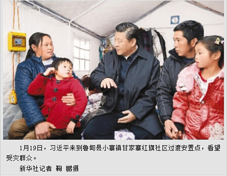 2014年8月3日,云南昭通市鲁甸县发生6.5级地震,对群众生命财产和基础设施造成巨大损失。地震发生后,习近平总书记第一时间作出重要指示,要求全力以赴做好受灾群众安置和灾后恢复重建工作。5个多月过去了,灾区群众生活过得怎么样?恢复重建工作进展得如何?灾区群众还有哪些要求和期盼?总书记十分关心和牵挂。19日一大早,习近平从北京乘坐飞机直接前往昭通,一下飞机,就转乘汽车一路颠簸前往鲁甸县。