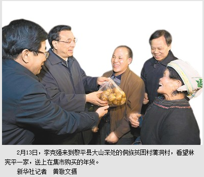 在喜迎新春佳节的日子里,李克强十分牵挂困难群众生活。他辗转来到大山深处的侗族贫困村蒲洞村,接连走进几家贫困户,查看家中存粮和饮水质量,询问还有哪些困难,并向他们送上在集市购买的年货。他还登上简陋的阁楼,了解房屋危险状况,看到村里还有不少房子透风漏雨,李克强神色凝重,他叮嘱随行负责同志说,这是“民生之痛”,一定要加快农村危房改造,努力让群众住得安全、温暖。在村卫生室,李克强详细了解村民就医、药品价格等情况。他对村医说,你们是最贴近群众的“白衣卫士”,国家要进一步提高广大村医收入,解除后顾之忧,让你们更安心地服务好农民。他指出,打好扶贫攻坚战,根本要靠发展。我们将持续加大对贫困地区道路、水利等基础设施投入,增加医疗卫生、生态保护等公共服务供给,这都是扶在根上、帮在点上的举措,广大干部要扑下身子,真抓实干,一起努力拔掉“穷根子”。