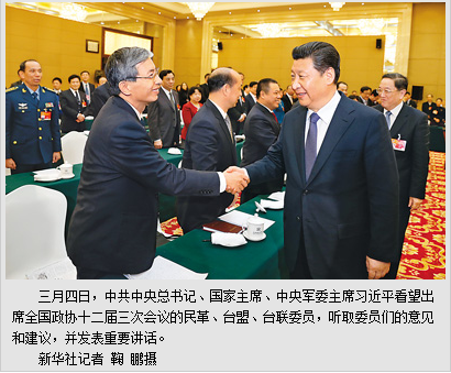 新华社北京3月4日电 中共中央总书记、国家主席、中央军委主席习近平3月4日下午看望了参加全国政协十二届三次会议的民革、台盟、台联委员,并参加联组会,听取委员们意见和建议。他强调,两岸关系和平发展是一条维护两岸和平、促进共同发展、造福两岸同胞的正确道路,也是通向和平统一的光明大道,我们应该坚定不移走和平发展道路,坚定不移坚持共同政治基础,坚定不移为两岸同胞谋福祉,坚定不移携手实现民族复兴。