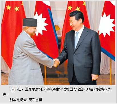 习近平欢迎亚达夫来华出席博鳌亚洲论坛年会。习近平指出,中国和尼泊尔是唇齿相依的亲密友好邻邦,是大小国家和平共处、互利合作的典范。我们珍视中尼传统友谊,愿同尼泊尔做政治上相互尊重、相互支持的好朋友,经济上共同发展、共同繁荣的好伙伴,安全上相互依赖、相互依靠的好邻居。