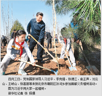 谈起造林绿化工作,习近平指出,经过新中国成立以来特别是近30多年来不断植树造林,我们国家树更多了、山更青了、地更绿了。中国在植树造林方面为人类作出了重要贡献。同时,我们也要看到,与全面建成小康社会奋斗目标相比,与人民群众对美好生态环境的期盼相比,生态欠债依然很大,环境问题依然严峻,缺林少绿依然是一个迫切需要解决的重大现实问题。我们必须强化绿色意识,加强生态恢复、生态保护。这是个历史性的时刻。