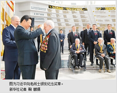 颁奖结束后,习近平发表讲话,代表中国政府和人民向老战士们致以崇高敬意和诚挚问候。习近平指出,第二次世界大战期间,白俄罗斯人民打响了卫国战争的第一枪,表现出百折不挠的英雄主义精神,赢得了世界各国人民的广泛赞誉和尊重。今年也是中国人民抗日战争胜利70周年。中国人民抗日战争开始时间最早,持续时间最长,付出的牺牲也最大,为世界反法西斯战争胜利作出了不可磨灭的重要贡献。当年在共同抗击法西斯主义和军国主义侵略的战争中,白俄罗斯人民同中国人民并肩作战,用鲜血结下了牢固友谊。我们深切怀念那些为夺取抗战最终胜利、保卫世界和平而献身的两国英烈,中白两国人民将永远铭记他们的丰功伟绩。卢卡申科总统在卫国战争历史博物馆新馆开馆时曾说过,对篡改第二次世界大战历史、美化侵略的企图,白俄罗斯人民绝不会答应。我对此深表赞同。我们愿同包括白俄罗斯人民在内的世界人民一道,共同维护第二次世界大战胜利成果和国际公平正义。