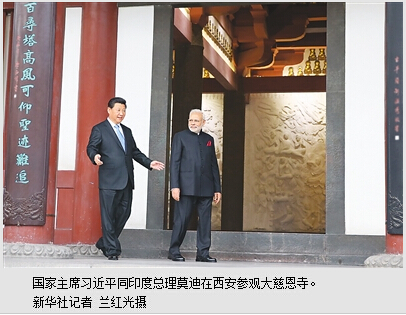 宝寺庄严,梵音可闻。习近平在大慈恩寺内迎接莫迪,两国领导人先后参观了大雄宝殿、大雁塔、玄奘三藏院。习近平表示,去年你专程陪同我访问你的家乡古吉拉特邦,介绍中国唐代高僧玄奘在古吉拉特邦研习佛经的情况。玄奘法师回国后,就在这座大慈恩寺翻译佛经。大慈恩寺是中印悠久友好交往的历史见证。今天,我们共同参观大慈恩寺,回顾中印两大文明交流互鉴、两国人民友好交往的历史,就是要推动两国友好交流,为中印关系发展增添新的活力。