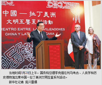 本报利马5月23日电 (记者吕鸿、王海林)当地时间5月23日上午,国务院总理李克强在利马考古、人类学和历史博物馆出席中国—拉丁美洲文明互鉴系列活动。