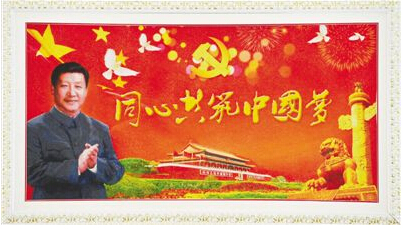 在展馆中厅的展墙上居中悬挂着长1.52米、宽0.8米的大幅绣匾。这幅绣匾以红色为基调,习近平总书记的肖像惟妙惟肖,金色的党徽、鲜艳的五星红旗、雄伟的天安门、庄严的华表、圣洁的和平鸽共同簇拥着七个金色的大字——“同心共筑中国梦”。