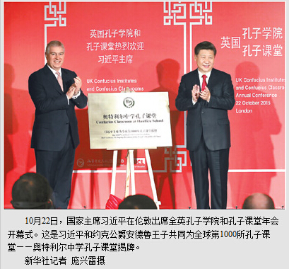 随后,习近平和约克公爵安德鲁王子共同为全球第1000所孔子课堂——奥特利尔中学孔子课堂揭牌。这所孔子课堂由北京八一中学和英属地泽西岛奥特利尔中学承办。
