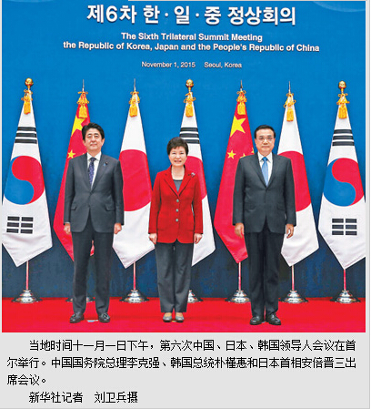 本报首尔11月1日电 (记者吕鸿、万宇、陈尚文)当地时间11月1日下午,国务院总理李克强在第六次中日韩领导人会议后,与韩国总统朴槿惠、日本首相安倍晋三共同会见记者。