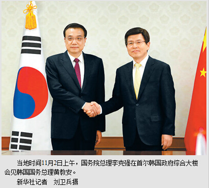 本报首尔11月2日电 (记者吕鸿、万宇、陈尚文)国务院总理李克强当地时间2日上午在首尔韩国政府综合大楼会见韩国国务总理黄教安。