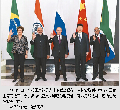 本报土耳其安塔利亚11月15日电 (记者杜尚泽、王云松)金砖国家领导人非正式会晤15日在土耳其安塔利亚举行,国家主席习近平、俄罗斯总统普京、印度总理莫迪、南非总统祖马、巴西总统罗塞夫出席。5国领导人就加强金砖国家沟通协调、共同应对全球挑战深入交换意见。