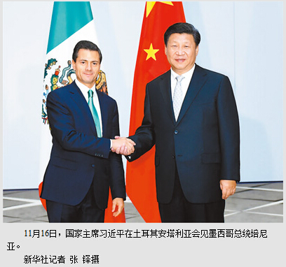 本报土耳其安塔利亚11月16日电 (记者杜尚泽、王云松)国家主席习近平16日在土耳其安塔利亚会见墨西哥总统培尼亚。