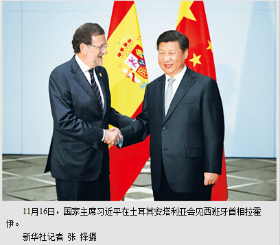 本报土耳其安塔利亚11月16日电 (记者杜尚泽、韩晓明)国家主席习近平16日在土耳其安塔利亚会见西班牙首相拉霍伊。