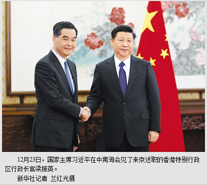 习近平表示,今年以来,梁振英行政长官带领特别行政区政府贯彻落实“一国两制”方针和基本法,为依法推进香港政制发展、发展经济、改善民生付出了艰辛努力,在许多领域取得了积极进展,香港经济社会大局保持总体稳定。中央对你和特别行政区政府的工作是充分肯定的。