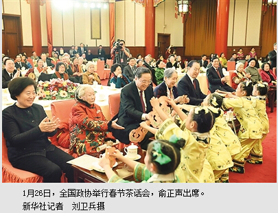 本报北京1月26日电 全国政协26日上午在政协礼堂举行春节茶话会,邀请已故知名人士和党外全国政协委员夫人欢聚一堂,畅叙友情,共贺新春。中共中央政治局常委、全国政协主席俞正声出席。