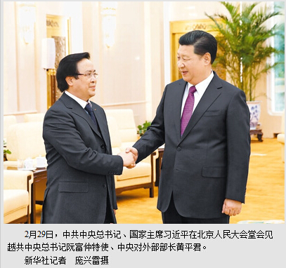 习近平感谢阮富仲的口信。习近平说,中越两党总书记互派特使,就党内和国内重要情况相互通报和致贺,是两党重要传统。此次越共十二大召开后,我们两党延续并发展了这一友好传统,对增进两党两国政治互信具有重要意义。