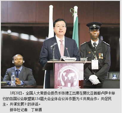 新华社卢萨卡3月21日电 (记者杨依军、彭立军)应各国议会联盟主席乔杜里邀请,全国人大常委会委员长张德江19日至21日出席在赞比亚首都卢萨卡举行的各国议会联盟第134届大会并讲话。