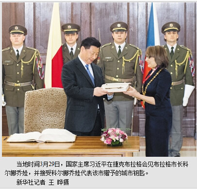 本报布拉格3月29日电 (记者杜尚泽、任彦)当地时间29日下午,国家主席习近平在布拉格会见布拉格市长科尔娜乔娃,并接受科尔娜乔娃代表该市赠予的城市钥匙。