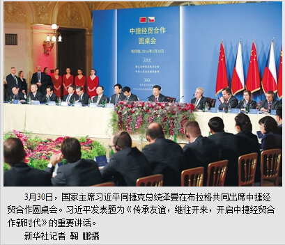 本报布拉格3月30日电 (记者杜尚泽、任彦)30日,国家主席习近平同捷克总统泽曼在布拉格共同出席中捷经贸合作圆桌会。习近平发表题为《传承友谊,继往开来,开启中捷经贸合作新时代》的重要讲话,强调中捷两国经贸合作有很多利益契合点,双方要增进协调配合,加强优势对接,创新合作模式,发挥比较优势,推动中捷经贸合作发展。