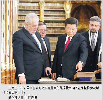 本报布拉格3月30日电 (记者杜尚泽、管克江)30日,国家主席习近平在捷克总统泽曼陪同下在布拉格参观斯特拉霍夫图书馆。