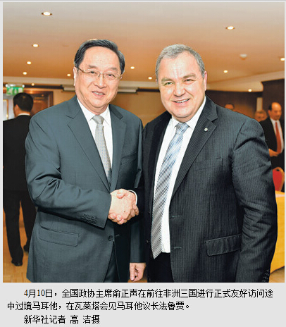 新华社瓦莱塔4月10日电 (记者李拯宇、李佳)全国政协主席俞正声10日在前往非洲三国进行正式友好访问途中过境马耳他,在瓦莱塔会见马耳他议长法鲁贾。